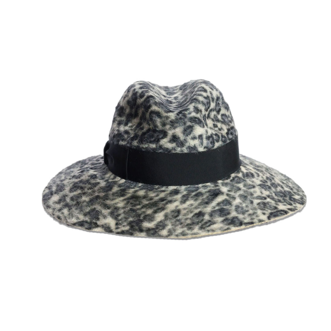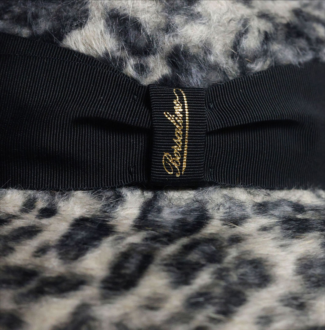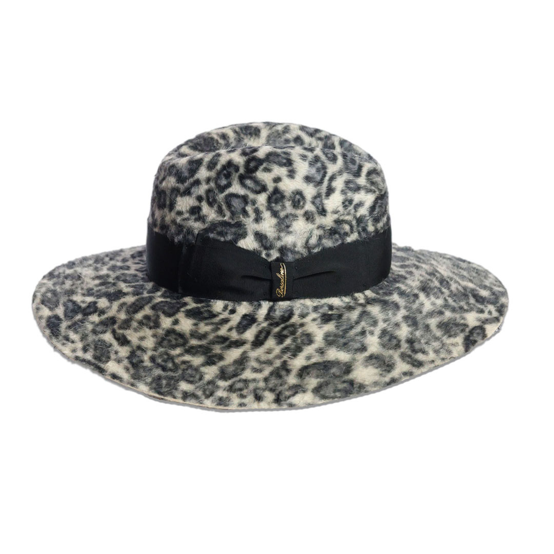 Cappello modello Sophie in feltro melousine leopardato grigio, nastro gros-grain a contrasto nero, tesa cm 9,5 , marchio Borsalino, made in Italy.