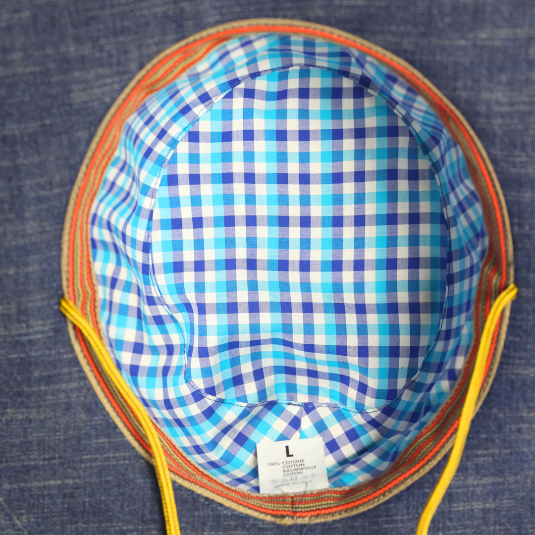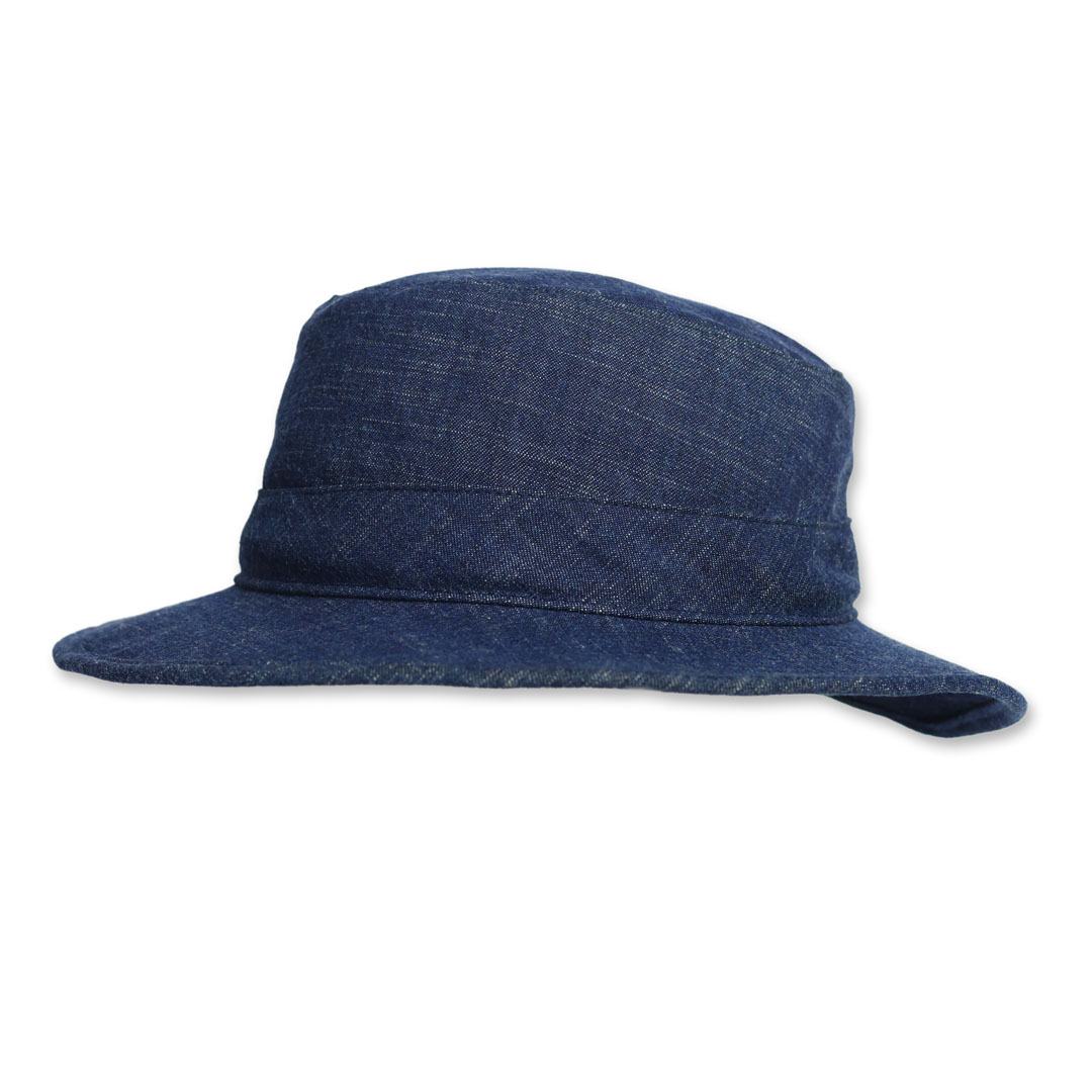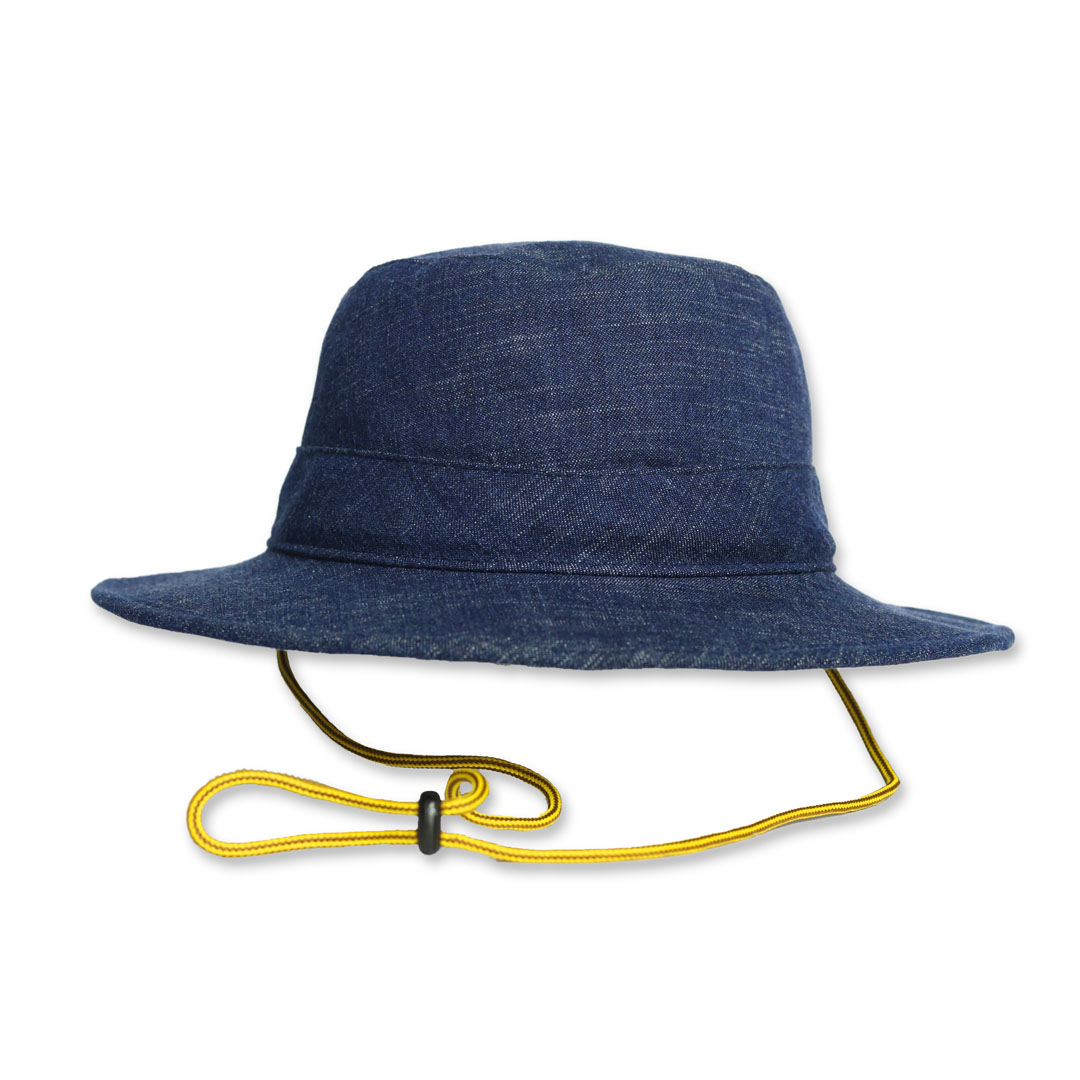 Cappello modello Bucket in 100% cotone colore jeans scuro, tesa larga cm 6 ,pieghevole ,laccio sottogola, unisex, made in Italy .