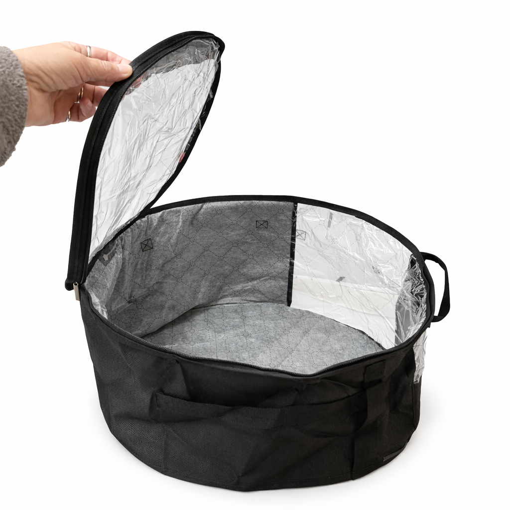 Cappelliera pieghevole in tessuto tnt e nylon con cerniera e maniglia, contiene fino a 3/4 cappelli, diametro 40 cm altezza max 25 cm.