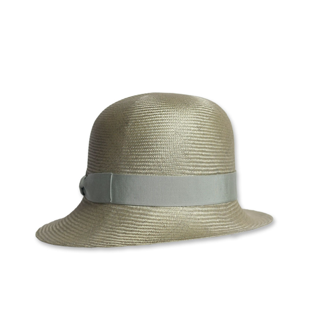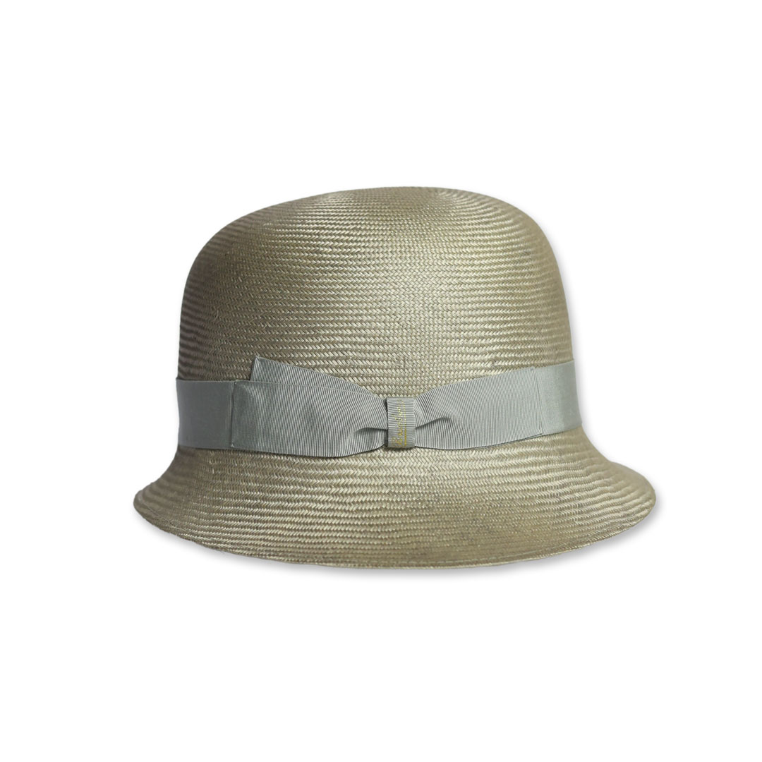 Cappello modello Cloche in 100% parasisol in grigio perla, nastro in gros-grain in tinta , tesa asimmetrica ,taglia unica M, marchio Borsalino, made in Italy.