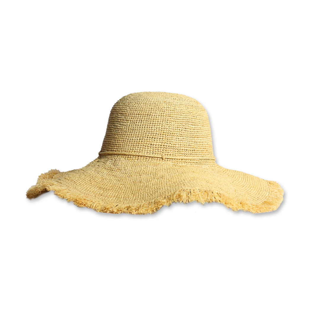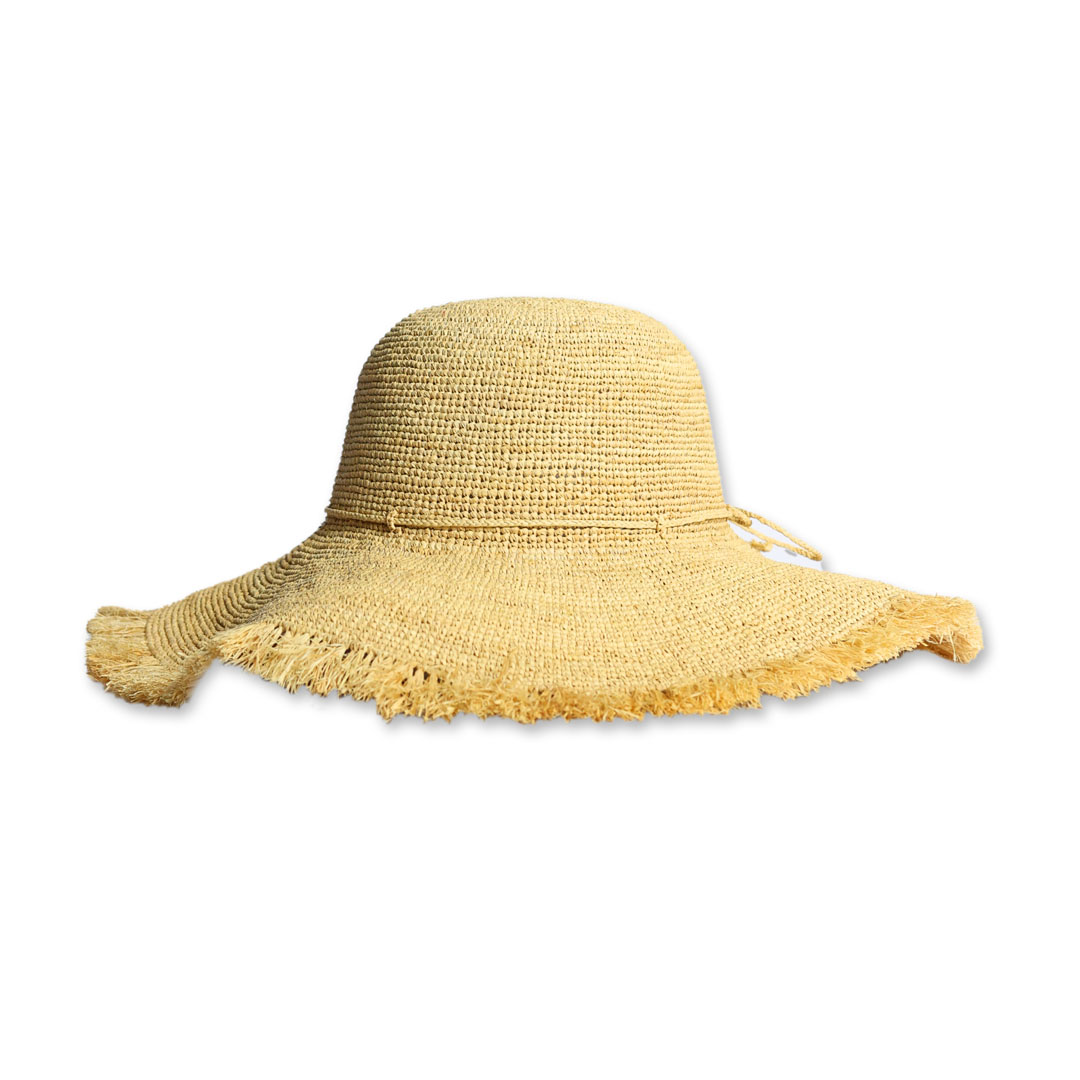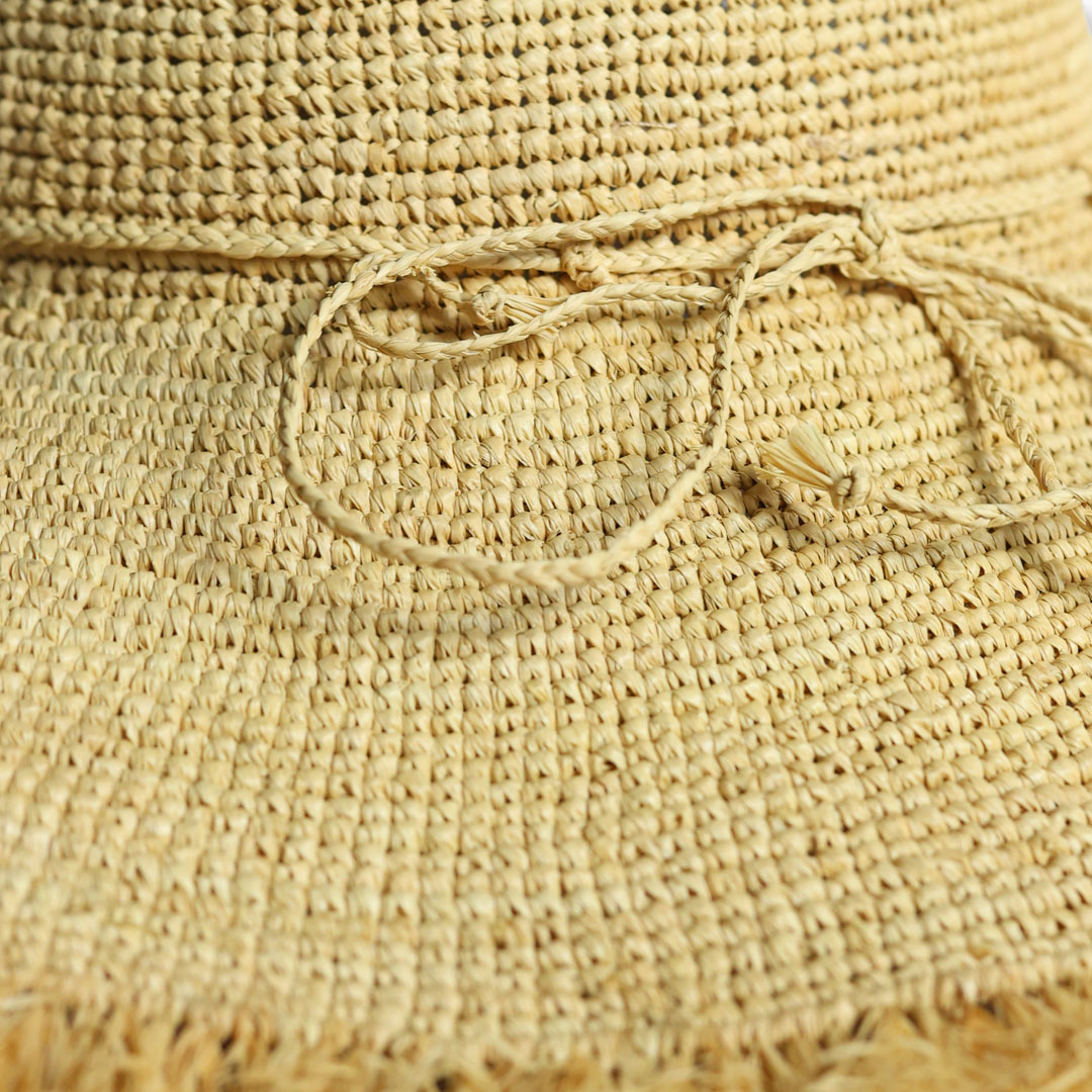 Cappello modello Cloche in raffia crochet color naturale , tesa 13 cm sfrangiata, nastro dello stesso, pieghevole, taglia unica , made in Italy.