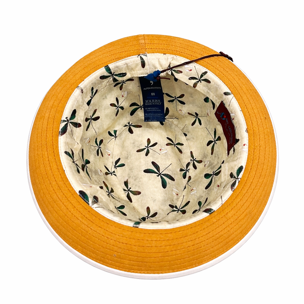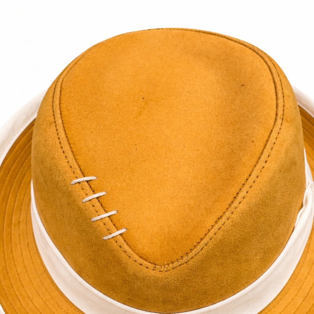Cappello modello Fedora in 100% vera pelle scamosciata color senape ,tesa modellabile di cm 96 , nastro e profilo in gros-grain panna ,fodera in 100% cotone fantasia, pezzo unico taglia 59 , marchio Alfonso D’Este, made in Italy.