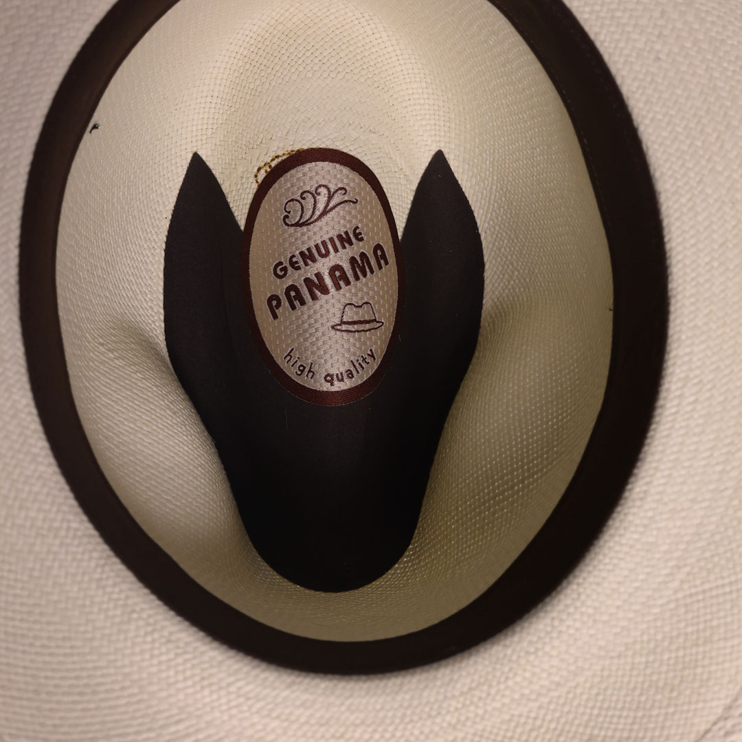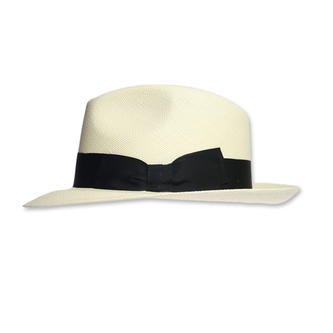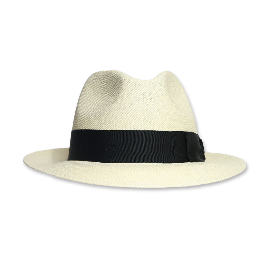 Cappello modello Fedora in 100% panama grana fine sbiancato , tesa cm 6 ,nastro gros-grain nero, unisex, made in Italy .