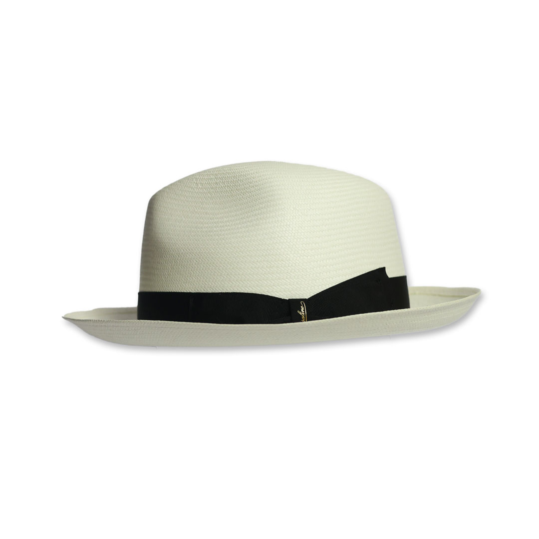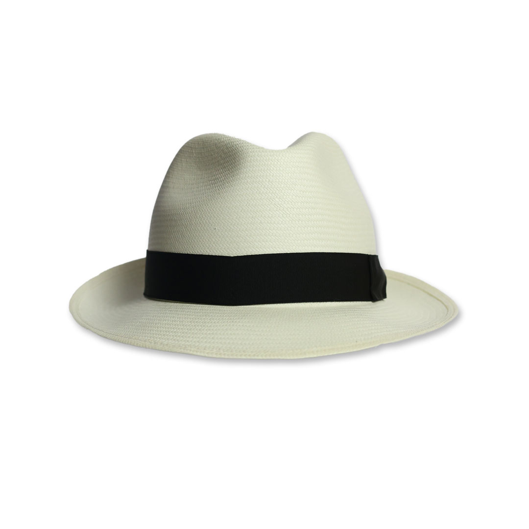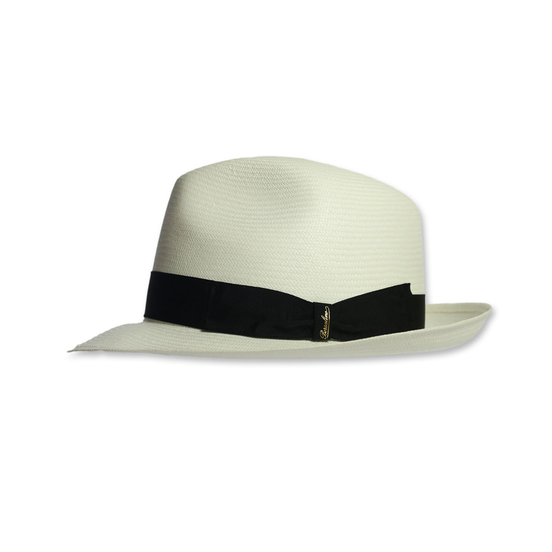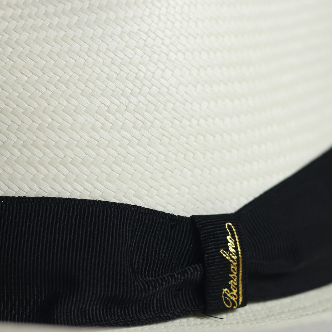 Cappello modello Fedora in 100% panama grana fine colore naturale sbiancato, nastro in gros-grain nero, tesa cm 6 , marchio Borsalino, made in Italy.