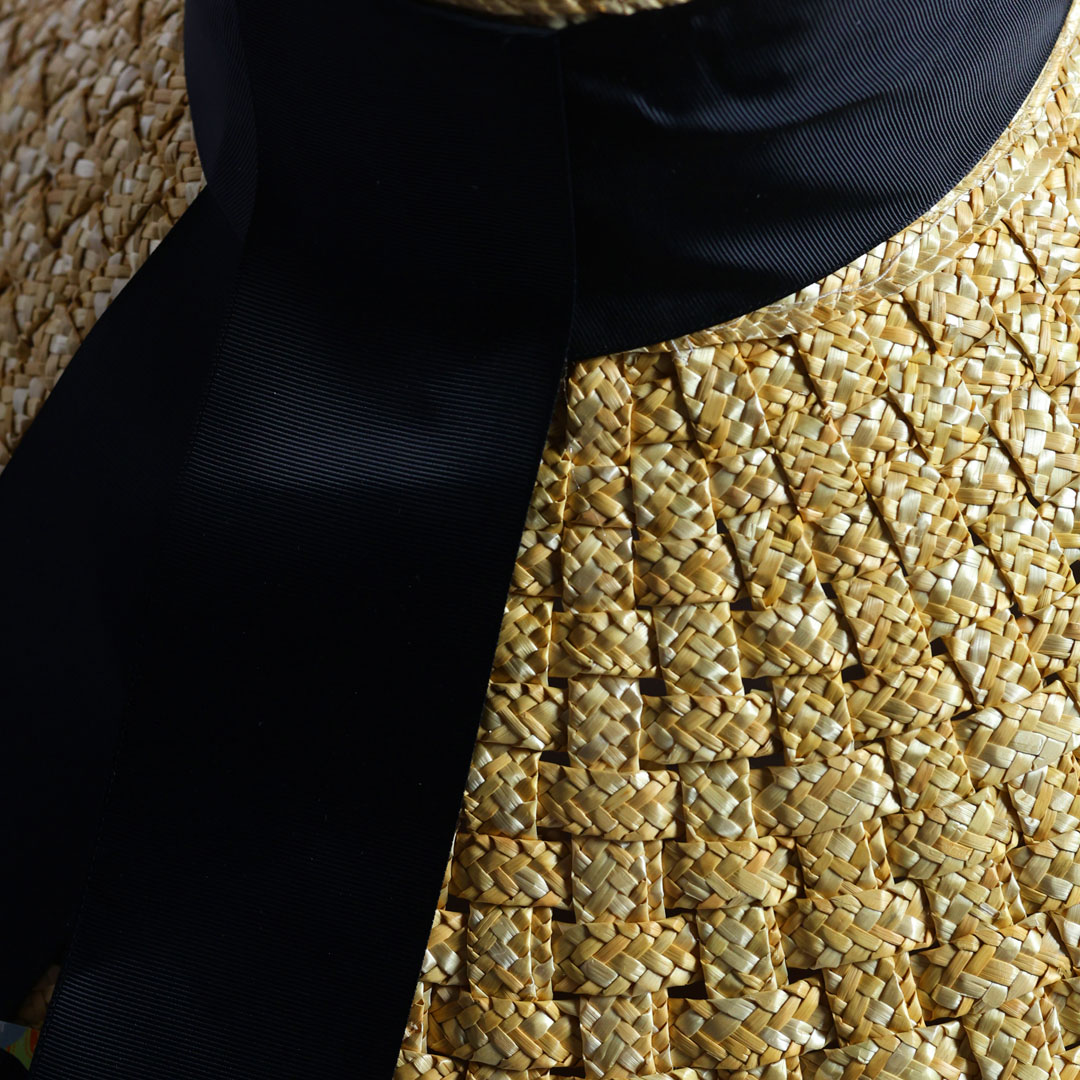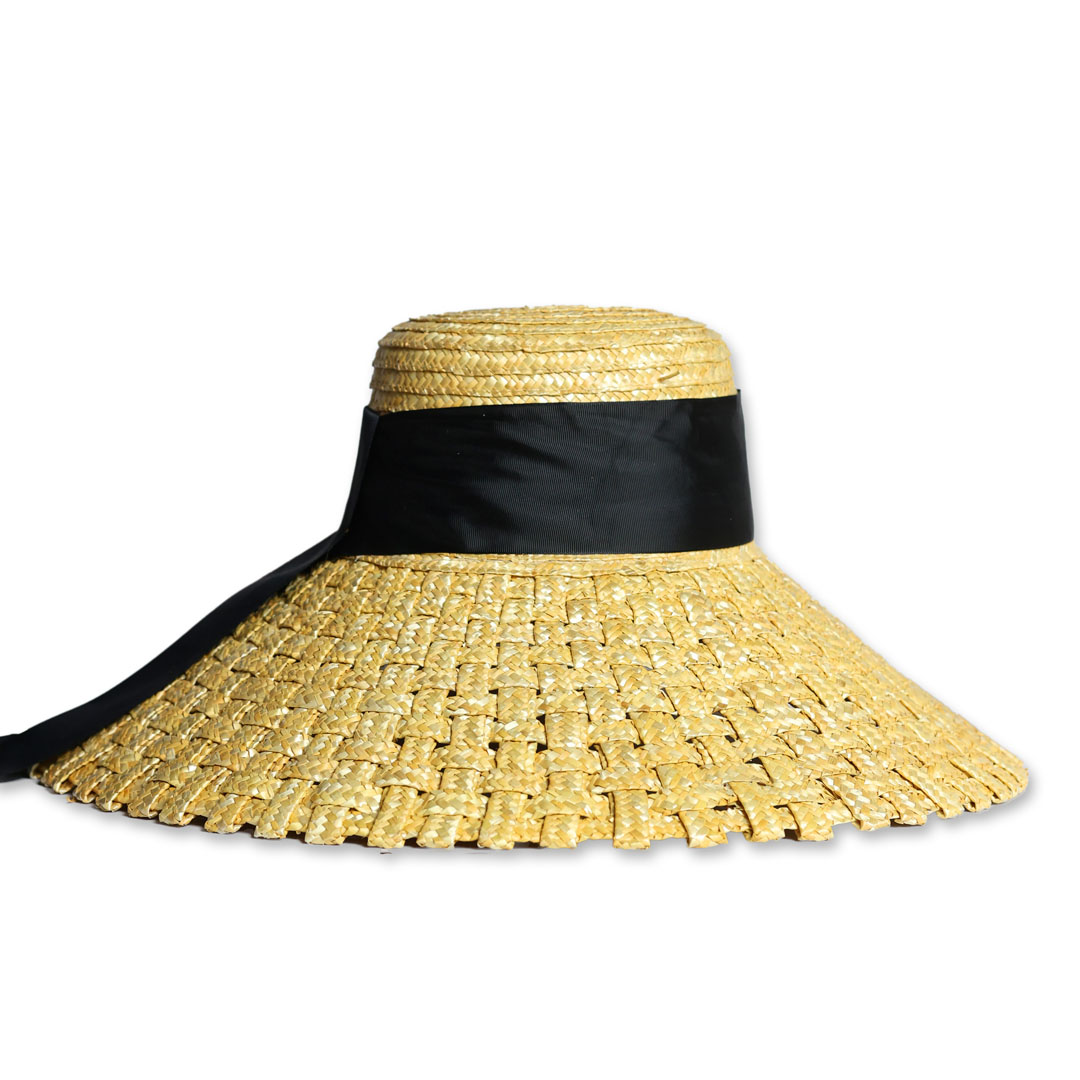 Cappello modello Melania in 100% paglia  color naturale  , tesa intrecciata cm 16 ,nastro in gros grain nero con fiocco posteriore, taglia unica M con regolatore interno, made in Italy .