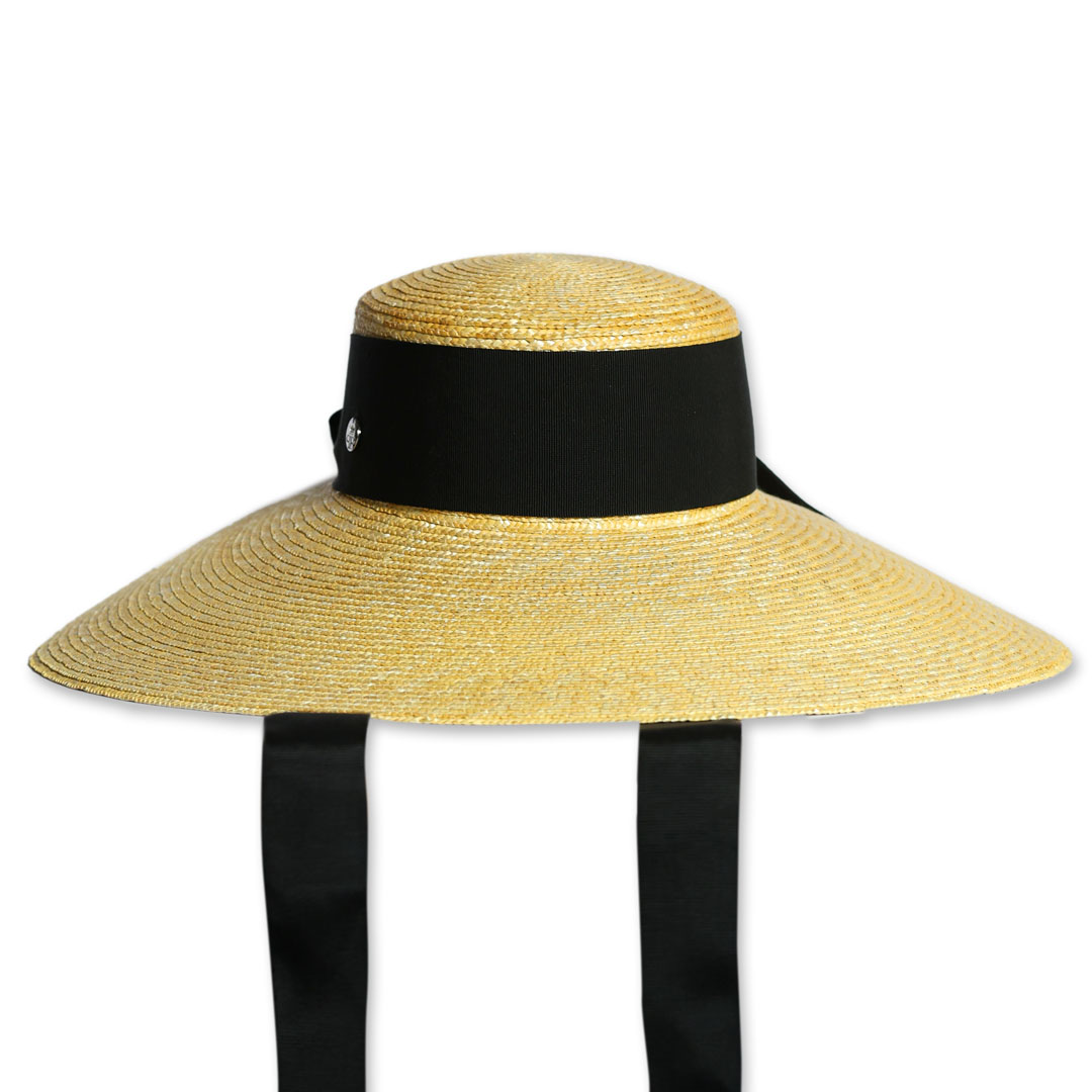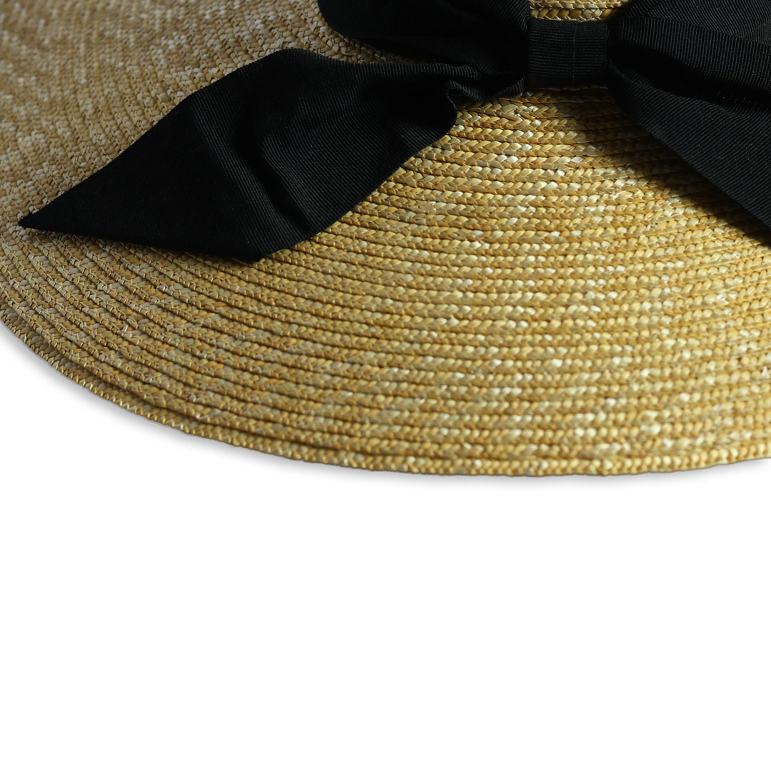 Cappello modello Melania in 100% paglia color naturale , tesa cm 16 ,nastro in gros grain nero con fiocco posteriore, sottogola in gros-grain, taglia unica M con regolatore interno, made in Italy .