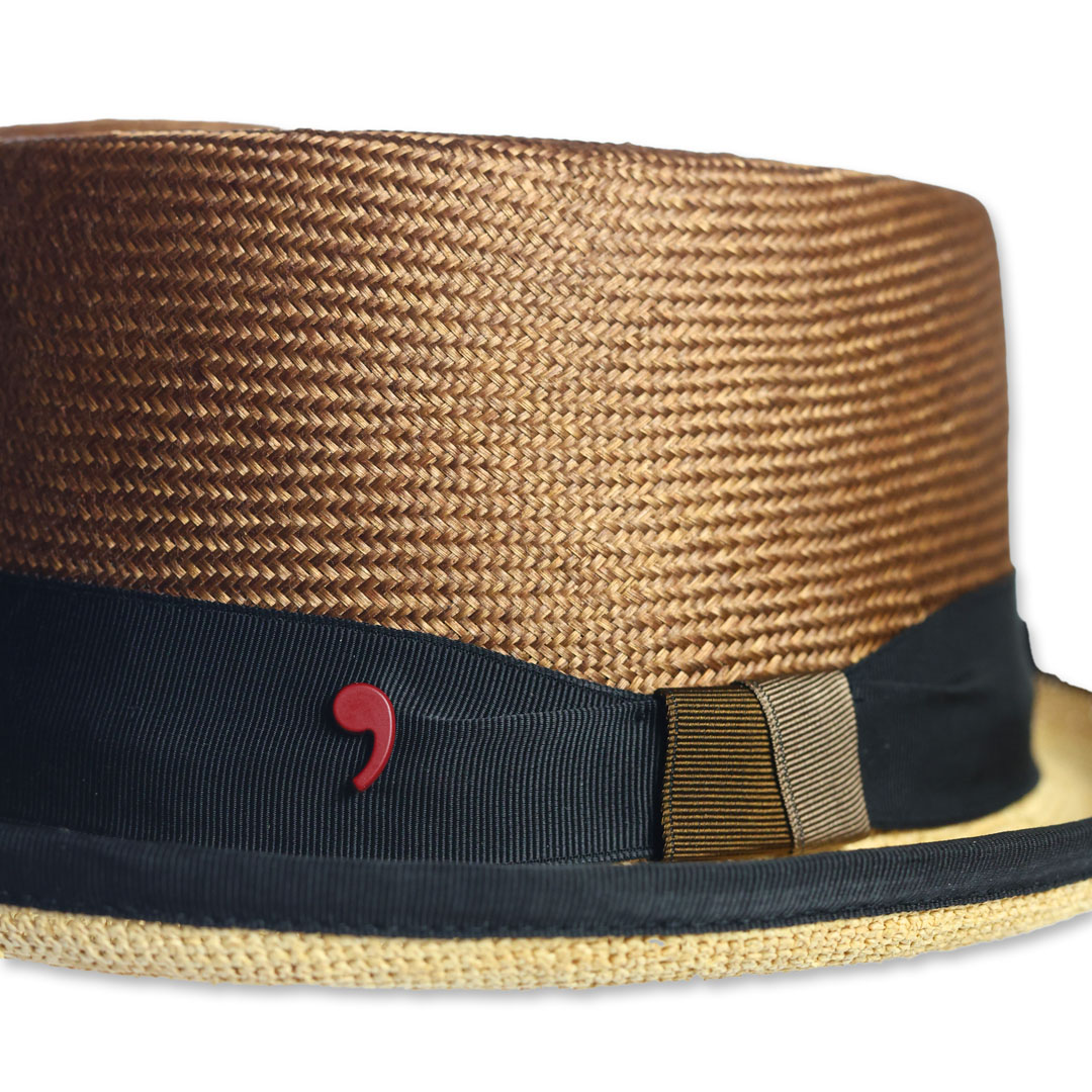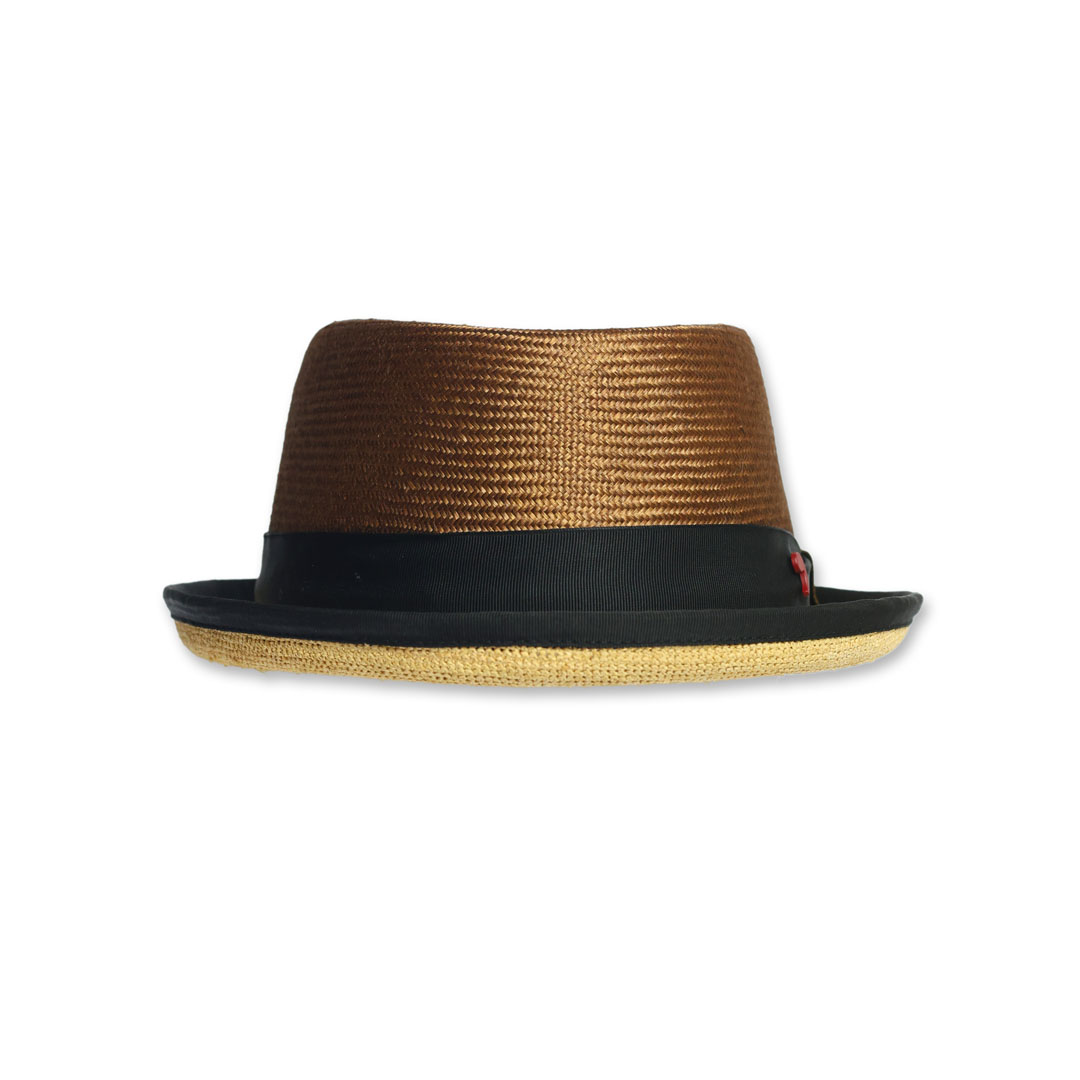 Cappello modello Pork Pie in paglia crochet e sisal color bruciato , tesa 4,5 cm colore naturale, nastro in gros-grain nero, unisex, marchio Alfonso D’Este , made in Italy.