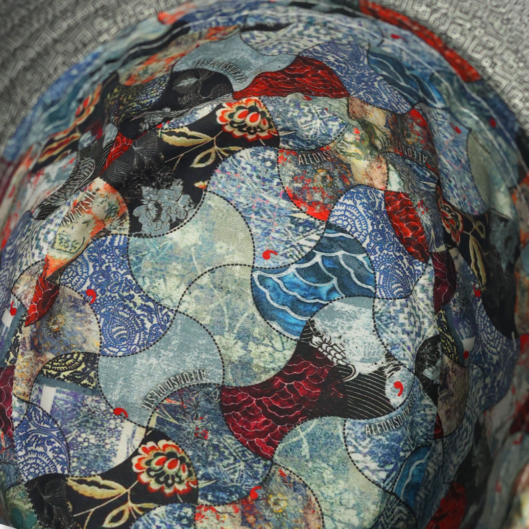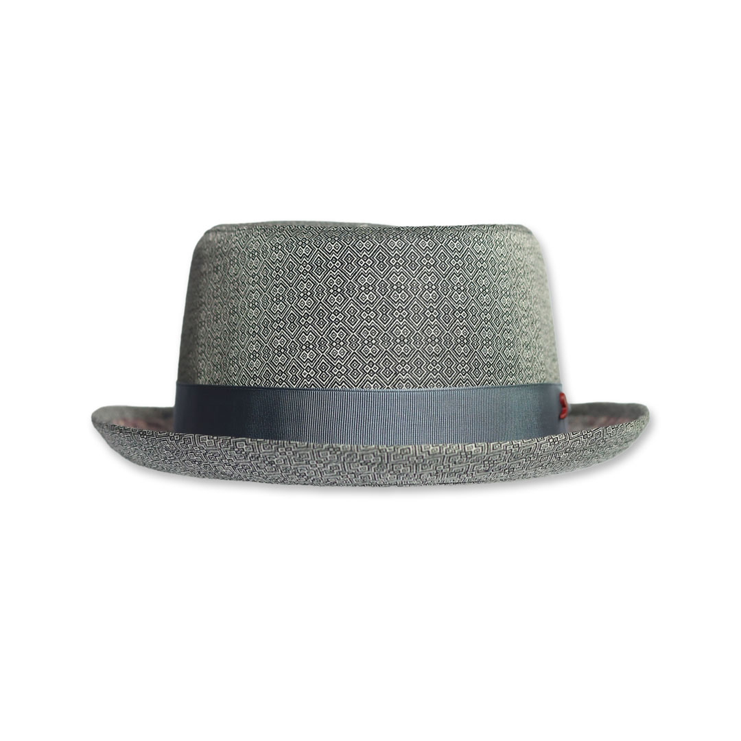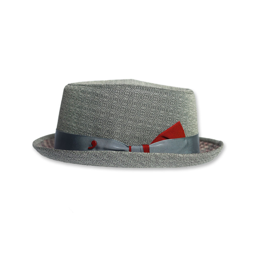 Cappello modello PorkPie in lana merino e seta  a fantasia , nastro in gros-grain in tinta, tesa a contrasto di  cm 4 ,marchio Alfonso D’Este , made in Italy.