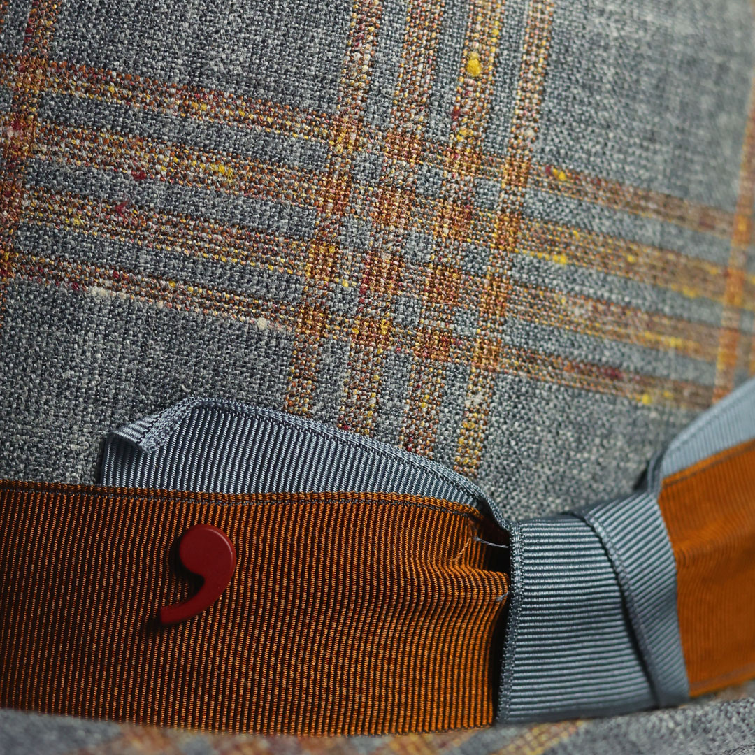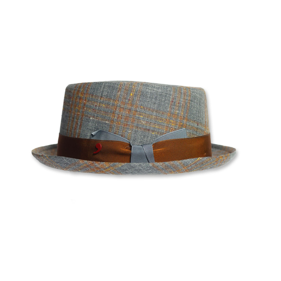 Cappello modello PorkPie in lana merino seta e lino a fantasia , nastro in gros-grain bicolor, tesa cm 4 ,marchio Alfonso D’Este , made in Italy.
