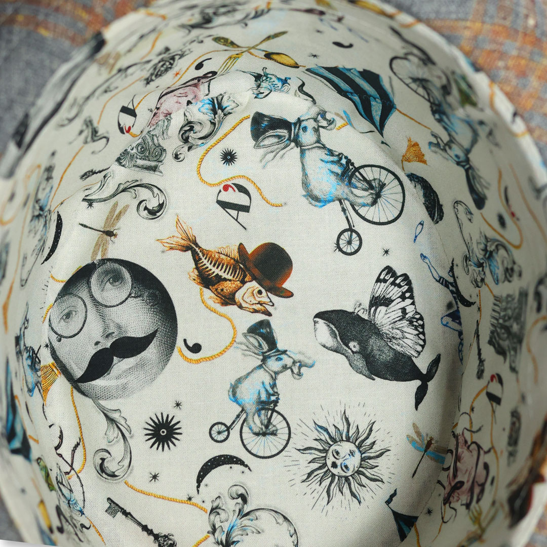 Cappello modello PorkPie in lana merino seta e lino a fantasia , nastro in gros-grainbicolor, tesa cm 4 ,marchio Alfonso D’Este , made in Italy.