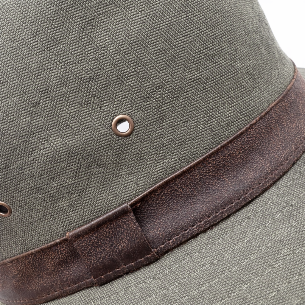 Cappello modello Traveller in cotone in tinta unita verde militare, fascia marrone in ecopelle, fodera interna in cotone, pieghevole, tesa cm 5,5, unisex , made in Italy.