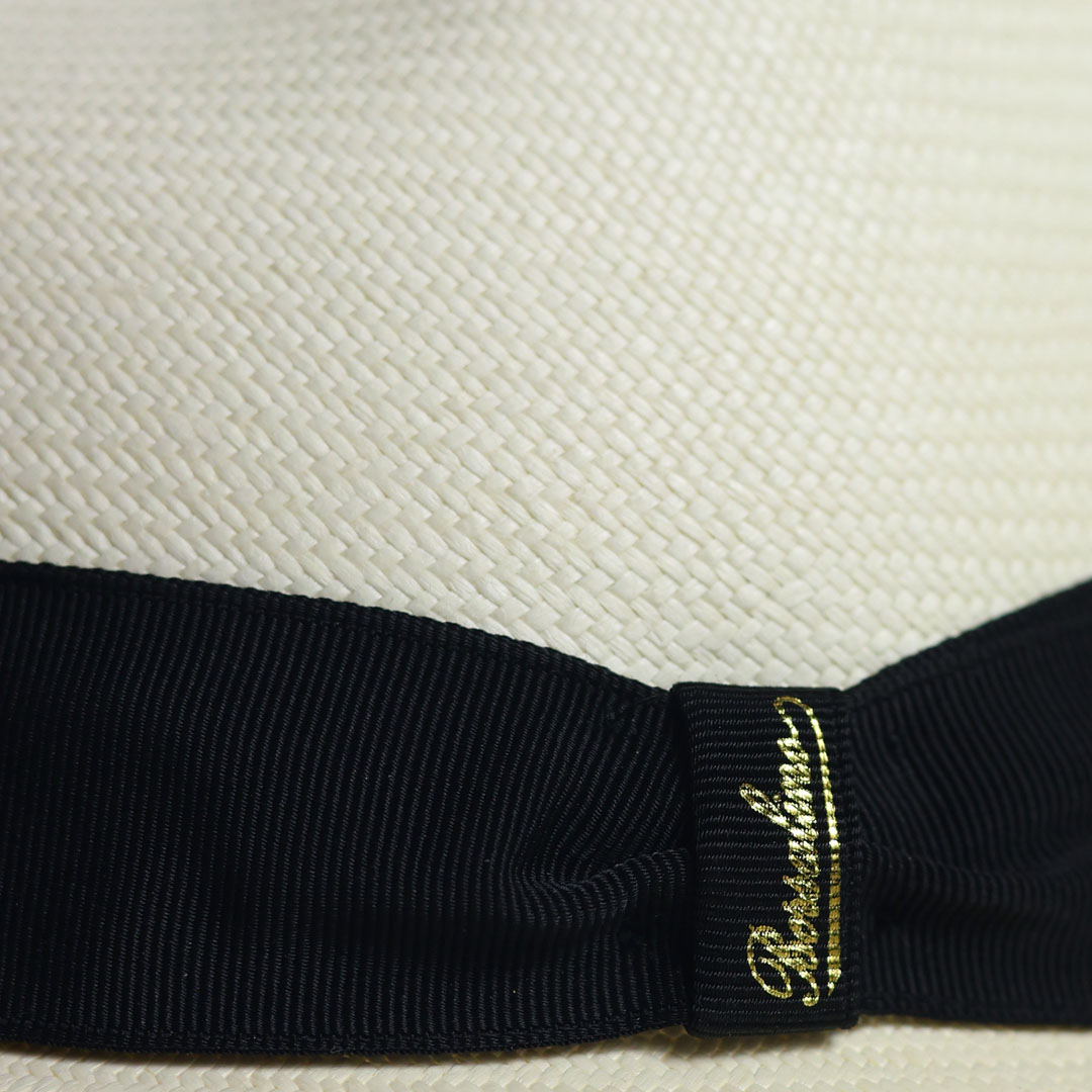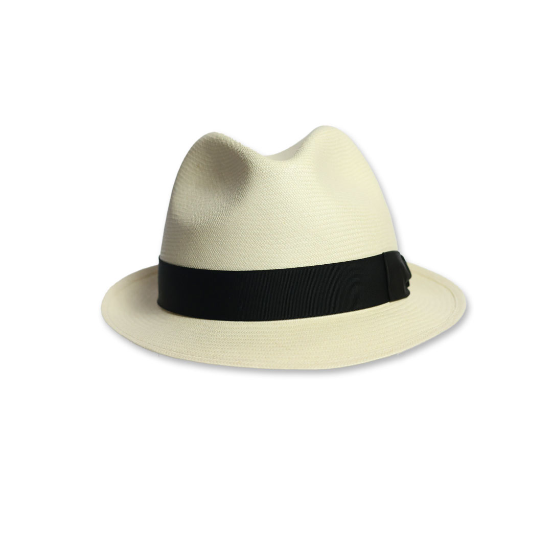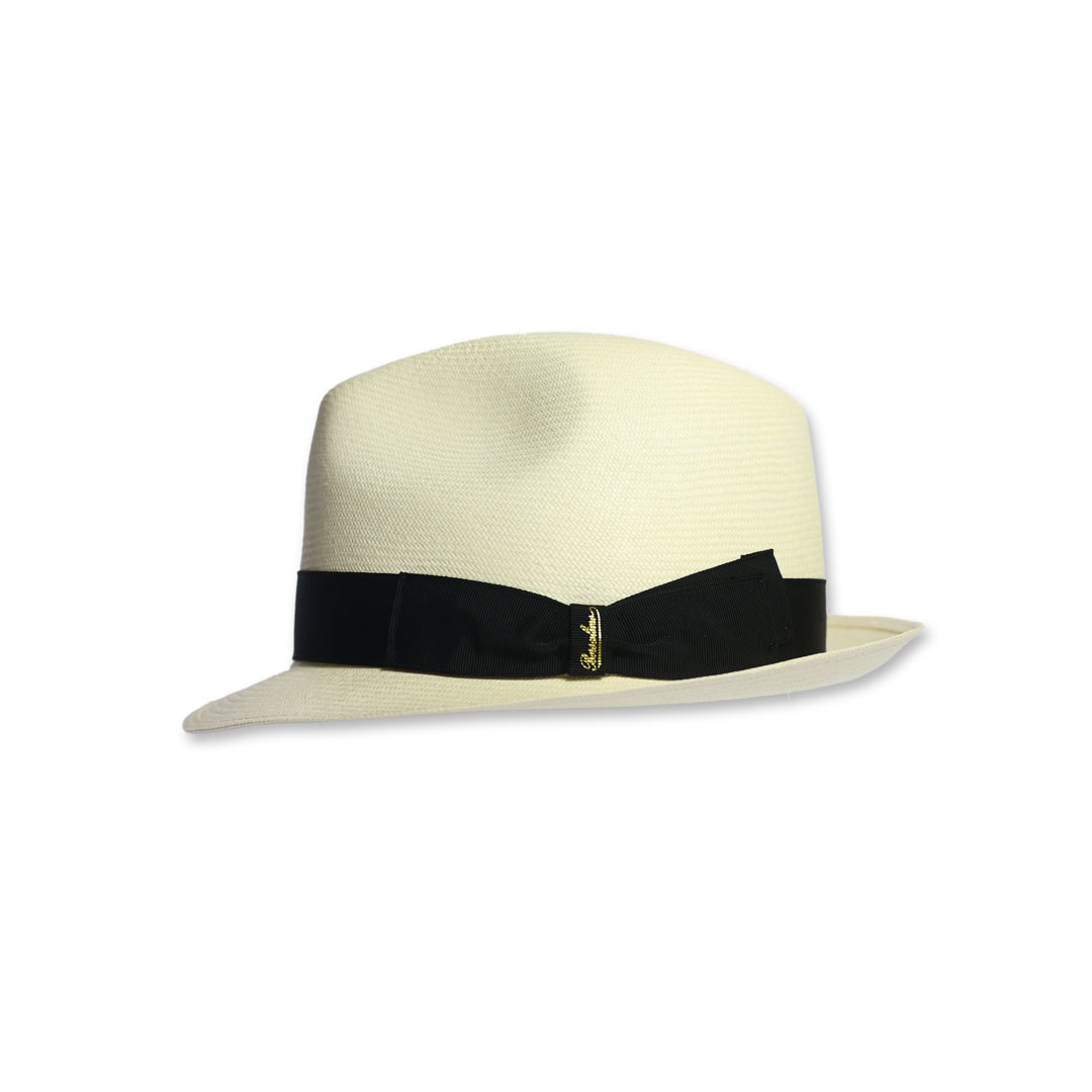 Cappello modello Trilby in 100% panama grana fine colore naturale sbiancato, nastro in gros-grain nero, tesa cm 4,5 , marchio Borsalino, made in Italy.